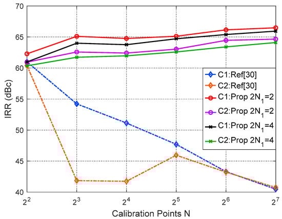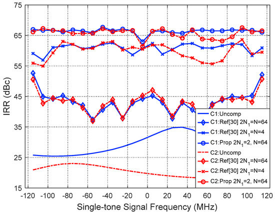 Figure 8 shows the amplitude spectrum of the single-tone signal (55 MHz) before and after imbalance compensation, respectively. The IRR of the single-tone signal before compensation is 53.1 dBc, and the IRR after compensation is 66.4 dBc (with 13.3 dB improvement). The DC amplitude of the single-tone signal before compensation is −37.3 dBFS, and the DC amplitude after calibration is −59.6 dBFS (with 22.3 dB decline). Figure 9 shows that for the proposed model, the greater number of calibration points, the higher IRR. When the number of calibration points reaches a certain level, IRR no longer significantly increases. While reference [30] uses all calibration points to fit frequency-dependent imbalance parameters, the more calibration points there are, the more unnecessary points are introduced, resulting in large errors after fitting. Figure 10 shows the distribution of IRR in the baseband before and after compensation for Case 1 and Case 2. The average IRR of the mismatch cases without compensation are IRRC1 = 29.1 dBc and IRRC2 = 20.3 dBc. When N = 64 and 2N1 = 2 (the filter length is also 2), the average simulation results of the proposed model are IRRC1 = 66.2 dBc, IRRC2 = 65.7 dBc. With the same configuration conditions, the results of reference [28] are that when the filter length is 2, IRRC1 = 44–54 dBc; when the filter length is 3, IRRC2 = 35–46 dBc.