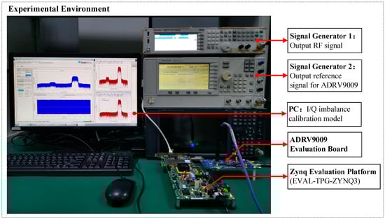 We use the mismatched data of the ADRV9009 receiving channel for experimental verification of the calibration model proposed in this paper. The ADRV9009 transceiver has an embedded DC offset calibration, so only the IQ imbalance calibration can be turned off. The environment for our experimental operation is shown in Figure 11. We use MATLAB [37] to build the I/Q imbalance calibration model to deal with the received mismatch data offline. The hardware modules mainly include ADI’s ADRV9009 Evaluation Board, Xilinx’s Zynq Evaluation Platform (EVAL-TPG-ZYNQ3) and RF signal generator. During the experiment, we turned off the I/Q calibration mode of ADRV9009 and used the Python to edit the script to call the function provided by the ADI company to read the memory (RAM) data of the Zynq evaluation platform. Then, we used the TCP protocol to establish a connection with MATLAB in order to transfer experimental data.