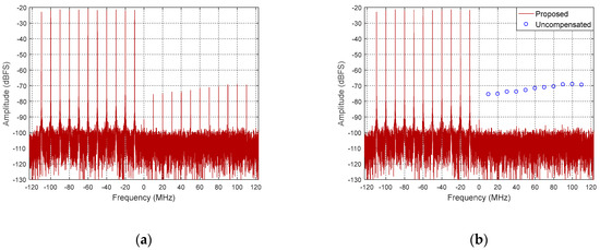 The amplitude spectra of wideband signal: (a) before imbalance compensation; (b) after imbalance compensation. The number of calibration points N = 64 and the number of signal points 2N1 = 2.