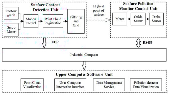 The method proposed in this paper mainly includes three parts, surface topography measurement method, motion control strategy of surface pollution detector, and the human-computer interface. The program block diagram is shown in Figure 1.