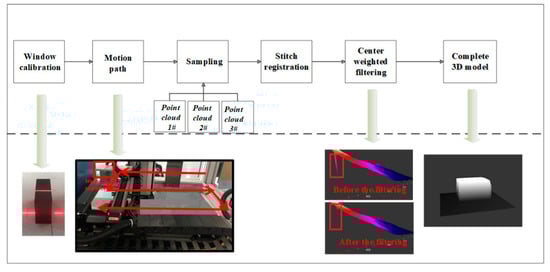 As shown in Figure 5, the profilometer moves from the initial position point  to point , resulting in  networked 3D point cloud images. After the complete scanning, the profilometer is returned to the origin.