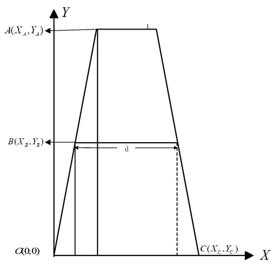 The effective measurement area of the profilometer is distributed in the shape of a trapezoid. In the measurement area of the profilometer, the bottom edge of the trapezoid is the X-axis. The X-axis intersects the vertical line Y at O as the origin to establish a two-dimensional plane coordinate system, where Point A is the end point of the upper base of the trapezoid, Point B is the point on the waist of the trapezoid, and Point C is the end point of the lower base of the trapezoid. In the extreme case, the highest point of the target surface does not exceed Point B, to avoid the height of the surface from overflowing the effective measuring range of the profilometer. The single scanning width of the profilometer cannot exceed d. The position of Points A, O and C may be fixed by the way of window calibration, and the effective scanning width  of the profilometer is calculated as: