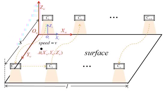 In the measurement window, establish a world coordinate system., carrier coordinate system , make the  axis in the carrier coordinate system parallel to the  axis in the world coordinate system, and control the laser profilometer on  the shaft moves at a constant speed. Nevertheless, there is an acceleration and deceleration process in the movement of the laser profilometer. Therefore, before the  axis of the carrier coordinate system coincided with the  axis of the world coordinate system, the profilometer must move at a constant speed to ensure that the coordinate system of the terrain world  on the axis was evenly sampled, and the 3D model recovered later would not be distorted. Set the measured plane length to , the profilometer scan frequency to , and the speed of the profilometer to move from  point to  point to . Then in a single scan, the line resolution on the  axis  is expressed as: