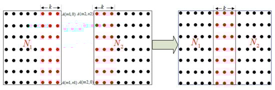 Looking at the trajectory of the profilometer in Figure 5, there is a reverse relationship between the two point cloud images of  and . The storage is in a sequential order, and they are opposite in space position. The point clouds need to rotate 180° for misalignment registration. Considering avoiding loss of sampled data points, there were  resampling units in the two point cloud images, and the stitched boundary point cloud data was obtained by means of averaging.