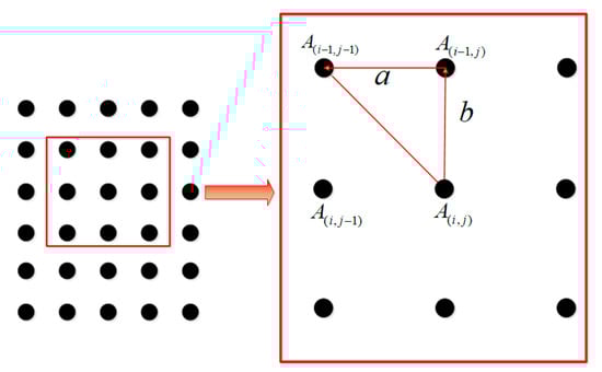 In Equation (8),  stands for that the Point Cloud  has the similarity between a point and Point Cloud  in the spatial neighborhood.  is the point coordinate position of the Point Cloud  area, excluding the Point Cloud  The formula  represents the filter weight of the Point Cloud  points in the spatial neighborhood, and finally, the value after . The  axis and the  axis of this system were different as far as the resolution is concerned, and the resolutions were higher. Additionally, the elevation information between adjacent point clouds had a high similarity. Each point in the traditional median filter window shared the same weight value. As a result, a large deviation occurred between the output response of the filter window and the true value.  deviation of this kind was easy to cause error transmission with the movement of the filter window. Comparatively, the median weighted filtering based on the Euclidean distance of the point cloud assigned the weight of the point cloud by the distance between the point clouds. The filter output obtained by this method may effectively reduce this deviation.