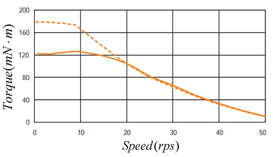The points A and B at the bottom of the probe are not in a uniform horizontal plane. The lowest, Point A of the probe position, is used as the reference position for channel control, and the horizontal position of A is recorded as the initial horizontal position of the detector as the motion control input of the detector. The driving motor was the STM11Q-3RE high-precision stepper motor produced by Shanghai MOONS Electric Ltd. The working DC voltage was 15–30 V in the RS-485 communication mode. The maximum output torque was 120 . The torque curve of the motor is shown in Figure 11, where the dotted line is the torque curve of the motor under no load, and the solid line is the torque curve at full load.