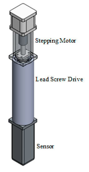 The surface pollution detection unit is a device used to measure the radioactivity on the target surface. A semiconductor α and β particles detector was arranged to detect the target. The surface contamination detection subsystem consists of a front-end sensor measurement channel, a probe data processing box and an industrial computer. Distributed in  array, a single channel is composed of a surface contamination detector, an adjustable screw and a stepper motor. The single channel is shown in Figure 12.