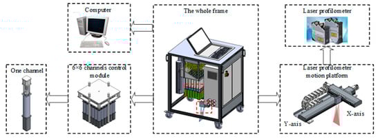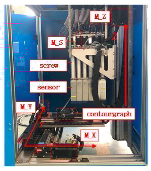 According to the mechanical structure of the system, the corresponding physical platform was built, as shown in Figure 14.  is the Z-axis ready to control the up and down movement of the 6 × 6 array detection channel platform,  is the X-axis and  is the Y-axis, and  is responsible for the single-channel detector movement. The overall support frame was built with anodized aluminum profiles in conformity with the European Commission’s standard;  and  worked with the TL170 single-arm motion platform. This is a semi-closed screw series with the motor power up to 400 W and the repeat accuracy ±0.02 mm;  used the M2DV-4D52R servo motor as the drive, and the mechanical layout of the detector was organized in a  array. As to the experimental platform, the overall dimensions are L900 × W800 × 1300 mm3, the X-axis travel is 400 mm, the Y-axis travel is up to 350 mm, the Z-axis travel is 450 mm, and the surface contamination detector travels up and down approximately 110 mm.