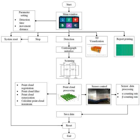 After the program starts, the initial position of the horizontal level of the detection channel will be self-checked. If the self-checking fails, it will prompt the coordinates of the abnormal channel position, and then perform the reset operation. After the self-test passes, the profilometer is initialized, and the point cloud data is collected and processed. The maximum height of the terrain corresponding to the 6 × 6 channels is calculated, and then converted to the motor feed. Subsequently, the pollution detector is controlled to move downwards. After moving to a given position, the surface α and β particles are collected, the detector data is read and stored in the database, and finally the terrain surface data and the detector measurement data are visualized in 3D and the data report is printed out to complete the above process prior to resetting the system.