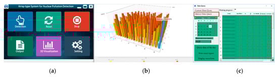 Figure 16 is the effect diagram of the software interface, where (a) is the main interface of the system, including six buttons for such functions as detection, reset, and stop, etc. The stop button has the highest priority and it interrupts the system process after the system is found to be abnormal, protecting the system from being damaged; (b) is a 3D histogram of the location of each detection channel and its corresponding surface terrain height and pollution meter detection value; (c) shows the interface as a visual interactive interface for historical data query, querying historical data at each time period, available for the printout of data reports.