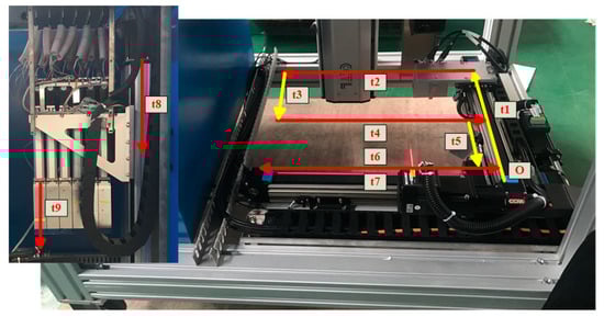 When testing the time overhead of the analysis system, we divided the movement of the profilometer into 7 segments ( to ), and the downward movement of the  array channel was divided into  to , as shown in Figure 17, where O is the initial position.