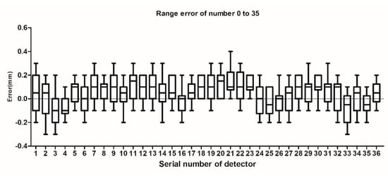 The test results are displayed in the paper in the form of a box chart, describing the distribution of error data for each channel. In Figure 19, the error box chart for channels 0 to 35. The motion control errors of all detection channels were basically distributed from −0.2 mm to +0.2 mm, with the maximum error of 0.4 mm.