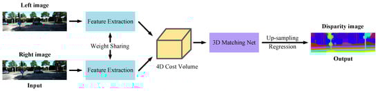 Deep learning has developed rapidly in recent years, showing strong image understanding capabilities. The convolutional neural network (CNN) was first applied to stereo matching for the calculation of matching cost []. CNN was used to extract features from images and computing the similarity score between patches. The matching cost is then processed by the cross-based cost summary module and the semi-global matching module. Inspired by the significant improvement that CNN yields, many neural networks-based algorithms were put forward, but most of them use CNN to solve the problem of computing the similarity score [,]. Recently, researches on end-to-end CNN methods were put forward in the stereo matching field. DispNet [] shows that the procedures of traditional algorithms can be integrated in stereo matching by using a CNN.