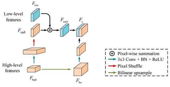 In many semantic segmentation works, integrating features of different scales is a crucial method to exploit context information and compensate for the low-level structure information loss caused by the deep network. High-level features have richer semantic information, but the resolution is low, and the ability to perceive details is poor. Therefore, the key is to recover the high-level features to high-resolution and fuse them with the low-level features. In Reference [], a novel method named sub-pixel convolution is dedicated to compensating the information loss caused by traditional interpolation upsampling. In addition, in Reference [], a novel upsampling block is proposed to fuse multi-scale features.