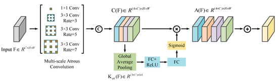 As mentioned before, obtaining rich context information features is very beneficial to the disparity estimation of the corresponding points especially in ill-posed regions. Existing CNN models [,] adopt a spatial pyramid pooling module to extract context information, mainly using pooling layers with different convolution kernel sizes. Similar to pyramid feature extraction in Reference [], we take the outputs of Dense Block 2 and Dense Block 3 to extract multi-scale features. The architecture of ACPFE block is shown in Figure 4. The outputs of Dense Block 2 and Dense Block 3 are taken as the inputs of two ACPFE block. Atrous convolutions are adopted to capture multi-receptive-field features without pooling loss information. There are a convolutional layer and three atrous convolutions whose dilation rates are set to 3, 5, and 7. Then the feature maps are combined. After that, motivated by the SENet [], a channel-wise attention method is introduced to re-weight the channel features and enhance the channel features with the most information. The feature map after global average pooling can be computed as follows: