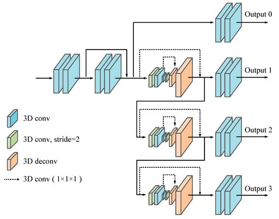 In most end-to-end stereo matching networks, a 3D convolution network is used to realize the disparity calculation. Motivated by PSMNet and GC-Net, a 3D convolution network is introduced in this paper to learn more context information from the dimensions of height, width, and parallax. The network uses an encoding-decoding structure to reduce the large amount of computational burden caused by 3D convolution. In the encoder part, 3D convolution with a stride of 2 is used for down-sampling, and in the decoder part, 3D deconvolution with a stride of 2 is adopted symmetrically to restore the size of matching cost volume. Due to the loss of spatial information, PSMNet connects the matching cost volume in the encoder and decoder. In this paper, motivated by Reference [], a 3D convolution layer is used to replace the original shortcut connection, seen as dashed lines in Figure 5. The architecture of the 3D matching net is shown in Figure 5. The network is composed of three stacked 3D encoding-decoding networks. It uses multi-scale features to fully extract context information and reduces the computational burden. Finally, the size of cost volume is restored to through bilinear interpolation to perform the following disparity regression calculation.