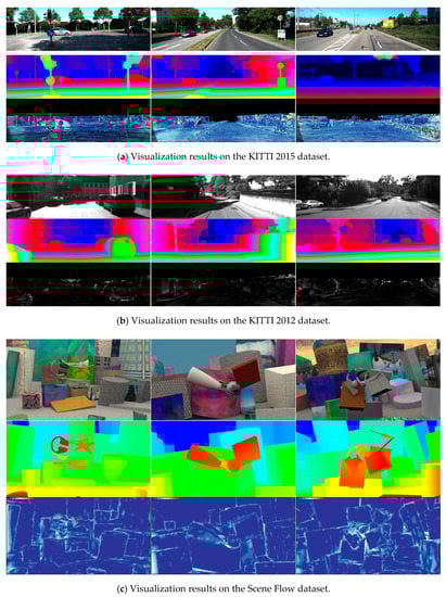 The MDA-Net is tested on three datasets: SceneFlow dataset, KITTI 2012 dataset, and the KITTI 2015 dataset. The experiment results are shown in Figure 6. The error maps present the differences between the predicted disparity map and the ground-truth in the form of pixels. It can be seen from the results that MDA-Net can obtain dense disparity maps in a variety of real road scenes and simulated scenes, especially in weak texture areas such as walls and car bodies on the map, which significantly improves the matching accuracy and reduces the probability of mismatch.