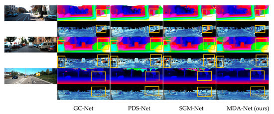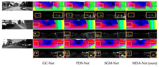 In the KITTI 2015 dataset, the network proposed has achieved better accuracy than the network listed. Figure 7 shows some disparity results generated by GC-Net, SGM-Net [], PDS-Net, and our proposed MDA-Net. In addition, the error maps (the blue points in the error map indicate the correct matching point, yellow points mean mismatched points, black points mean ignored points) given by the KITTI 2015 evaluation are shown in Figure 7. The yellow boxes in Figure 7 mark the parts where the matching results of each network are poor. The figure shows that MDA-Net generates more accurate disparity maps in untextured areas such as walls, the body of car, and lawn in Figure 7.