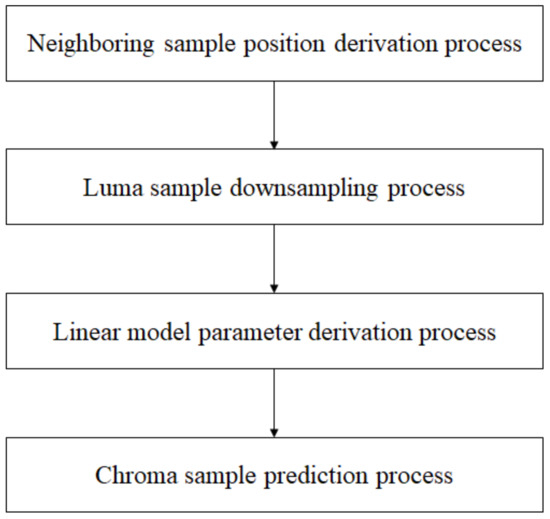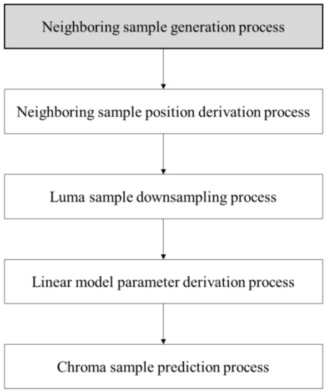 In VTM-6.0, when a chroma block is decoded as one of the CCLM modes, consisting of the LT_CCLM, T_CCLM, and L_CCLM modes [23,24], the linear model parameters are derived at the decoder from the reconstructed neighboring luma and chroma samples of the current block using the equation of the straight line. Then, the chroma samples in the current block are predicted by the downsampled reconstructed samples in the collocated luma block with the derived linear model parameters. Figure 1 shows the processing flow chart of the CCLM in VTM-6.0. As shown in the figure, the CCLM is composed of the neighboring sample position derivation process, the luma sample downsampling process, the linear model parameter derivation process, and the chroma sample prediction process. More specifically, each process of the CCLM is described as follows.