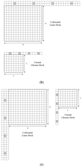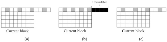 For the T_CCLM mode shown in Figure 8, based on the number of available top-right neighboring chroma samples, two different sets of subsampled neighboring sample positions can be selected in VTM-6.0, as shown in Figure 8a,b. On the other hand, in the proposed CCLM, only one set of fixed subsampled neighboring sample positions is derived, as shown in Figure 8c.