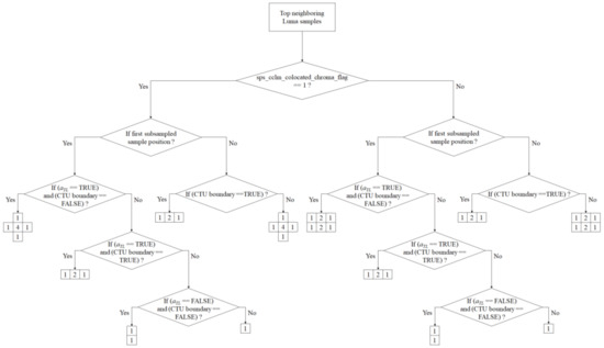 As listed in Table 4, for the downsampling of the collocated luma samples, when sps_cclm_colocated_chroma_flag is equal to 1, VTM-6.0 uses up to four different shapes of downsampling filter, whereas the proposed CCLM uses only one unified downsampling filter shape. Furthermore, up to four different shapes of downsampling filter for the top neighboring luma sample are used in VTM-6.0. However, in the proposed CCLM, up to two different shapes of downsampling filter are selected, according to only the CTU boundary condition. With regard to the conditional branch, 10 conditional branches for comparing various conditions, as shown in Figure 3, for the downsampling of collocated luma samples in VTM-6.0 are removed by the proposed CCLM. Similarly, nine conditional branches, as shown in Figure 4, for the downsampling of the top neighboring luma sample in VTM-6.0 are removed. Therefore, in the proposed CCLM, the conditions for selecting the different shapes of downsampling filter can be removed, thereby implementing the filtering operation by employing parallel processing.