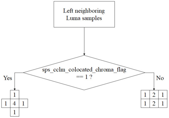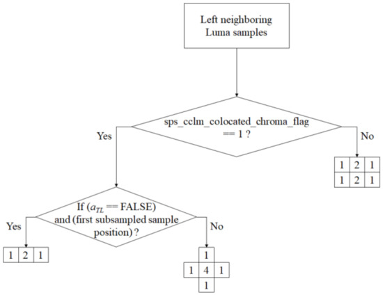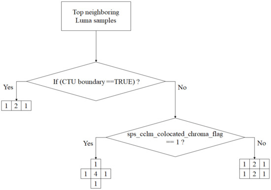 Second, in the luma sample downsampling process, the downsampled neighboring luma samples and the downsampled collocated luma samples are derived by downsampling the luma samples at the subsampled neighboring sample positions, and in the collocated luma block, according to the chroma subsampling ratio, respectively. For the chroma subsampling ratio of 4:2:0 or 4:2:2, the neighboring and collocated luma samples are downsampled before the linear model parameter derivation according to the chroma sample location. Basically, two different downsampling filter shapes, which are rectangular-shaped filters with filter coefficients of (1, 2, 1, 1, 2, 1) and a cross-shaped filter with filter coefficients of (1, 1, 4, 1, 1), are used for downsampling of the neighboring and collocated luma samples, depending on the chroma sample location type-0 and type-2 [27]. Here, high-level information, called sps_cclm_colocated_chroma_flag, is signaled to the decoder to indicate the chroma sample location type. The downsampling filter shapes are further modified based on the neighboring sample availability, the sample position within the block, the subsampled neighboring sample position, and the coding tree unit (CTU) boundary condition. Here, to reduce the line buffer requirement at the top CTU boundary, only one top neighboring luma sample line is used for the derivation of the linear model parameters [28,29].