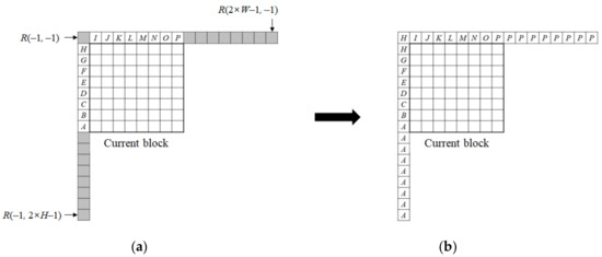 In VVC, the neighboring sample generation process is composed of the neighboring sample availability marking process and the neighboring sample substitution process. In the proposed CCLM, the reference sample availability marking process in VVC is reused without any changes to generate the neighboring chroma sample availability information, which represents whether each neighboring chroma sample is available or not. Based on the neighboring chroma sample availability information, to make all of the neighboring luma and chroma samples available, unavailable neighboring samples of the chroma block and those of the collocated luma block are substituted by the available neighboring samples, using the neighboring sample substitution process, as specified in VVC. The description of the neighboring sample substitution process in VVC is as follows. Considering that the dimensions of the current block are W × H, the general intra prediction requires a row of 2 × W reconstructed top and top-right neighboring samples, a column of 2 × H reconstructed left and left-below neighboring samples, and the reconstructed top-left corner neighboring sample of the current block. Accordingly, the neighboring samples of 2 × W + 2 × H + 1 length are used as a reference sample line for the general intra prediction. However, some samples along the reference sample line may be unavailable because the raster scan and z-scan orders are used in block coding order. Therefore, before the general intra prediction process, the neighboring sample substitution process is performed to ensure that any unavailable neighboring samples are properly substituted by the available neighboring samples. Figure 7 illustrates an example of the neighboring sample substitution process. In the figure, the square boxes indicate the sample positions, A to H and I to P in the unshaded boxes represent the available neighboring sample values of the current block, and the shaded boxes indicate the unavailable neighboring samples of the current block to be substituted. Using the neighboring sample substitution process, the unavailable neighboring samples in Figure 7a are substituted by the available neighboring samples, as shown in Figure 7b.