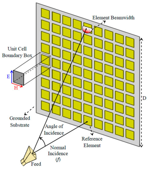 The array of resonating elements used to reflect the incoming signals from a suitably placed feed, defines the basic architecture of a reflectarray antenna [1,2]. It evolved from the combination of the concepts of a parabolic reflector and a phased array antenna. It holds the advantage of a flat and light structure over the parabolic reflector, whereas its simple design overcomes the flaws of the lossy phased arrays [3]. Reflectarray can attain high gain performance like a parabolic reflector and it can scan its beam over wide angles just like a phased array antenna [4]. All this can be achieved without adding any extra power dividing or phase shifting mechanism. A reflectarray can be of many types, including an array of reflecting waveguides [5] or a conventional reflecting surface of the microstrip patch array [1]. A full metallic reflectarray with variable size grooves [6] and a full dielectric reflectarray with implanted air holes [7] have also been introduced to overcome the effects of extra material losses [8]. The basic architecture of an offset feed square patch microstrip reflectarray is shown in Figure 1. The printed microstrip patches on a dielectric substrate are used to reflect the incident signals of a distant feed. The reference element on the reflectarray indicates a point with zero phase difference to reflect the incident signals. This phase difference progresses as the distance between the patches and the feed increases beyond the reference element. In order to maintain this phase difference, various techniques can be found in the literature. It can be done using patches with variable sizes [1,9], by using a variable rotational angle [10,11] or by adding an extra phase tuning slot or stub into them [12,13]. The main reason to maintain this phase difference is to reflect all the incoming signals in the same direction with the same phase [14]. In order to attain this progressive phase, a full wave analysis of the reflectarray is required by considering a single element as a unit cell [3]. The boundaries of the unit cell, as shown in Figure 1, determine whether the effects of its surrounding elements are considered or not. The infinite boundary conditions of the unit cell with electric and magnetic walls ensure the accumulation of the mutual coupling effects of the surrounding elements [15]. The beamwidth of the reflectarray element is also an important factor, which describes its ability to reflect incident signals. A wider element beamwidth is required to properly reflect the signals from the corner of the reflectarray.