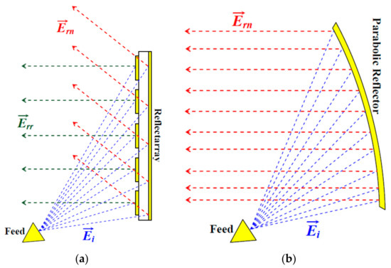 Reflection of the incident signals from the surface of the: (a) reflectarray and (b) parabolic reflector.
