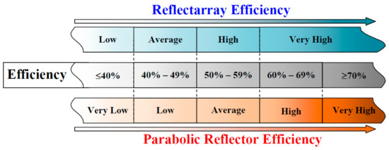 The lower gain performance contributes to reducing the efficiency of the reflectarray antenna. It implies one should consider 50% or more as a high efficiency for reflectarray antenna [19,20]; alternatively, this scenario is completely different for a parabolic reflector. Figure 3 relates the efficiency scenario of the reflectarray antenna with the parabolic reflector. It has been shown here that the quality of acquiring high efficiency in reflectarrays lags behind the efficiency performance of the parabolic reflector. However, it does not restrain reflectarray from achieving high efficiency performance [21,22]. If the reflectarray is optimized and designed properly, it can achieve an efficiency of around 60% [23].