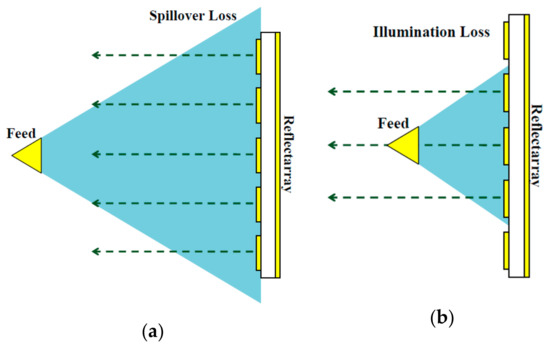 Sources of the aperture loss in the reflectarray antenna: (a) spillover loss; (b) illumination loss.