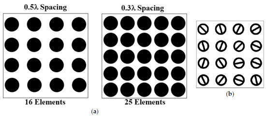 Figure 5 depicts some examples of sub-wavelength-based reflectarrays. It can be observed from Figure 5a that a higher number of elements can be occupied in the same physical area with sub-wavelength technique [54]. An increment in the number of elements can reduce the element loss and increase the gain of the reflectarray antenna. This work demonstrates a significant improvement in the efficiency of the reflectarray antenna from 50.8% to 56.6% when 0.5λ spacing elements are replaced with 0.3λ spacing elements. The sub-wavelength technique is also useful to support highly efficient performance for circular polarization operation [59]. Figure 5b shows the circular polarization reflectarray elements with angular rotation that acquires an efficiency performance of 51.9%. Embedding sub-wavelength technique in reflectarray is an easy way to improve its efficiency. However, it requires high precision in fabrication at high frequencies when the number of reflectarray elements is also very large.
