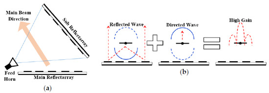 A perfectly designed feeding mechanism for a reflectarray antenna is considered as a backbone in its performance improvement with minimal aperture losses [60]. The main purpose is to offer a minimum aperture loss performance with possibly minimum cross polarization. The proper focusing of the incident signals on the reflectarray surface is very important to achieve high-efficiency operation with minimum phase delays in the reflected signal [61]. In this case, a secondary sub-reflector with the main reflectarray is normally used in the literature for gain and efficiency improvement [62]. The basic architecture of a reflectarray antenna with a sub-reflector is shown in Figure 6a [63], which is used to reduce the feed based losses from the proposed structure. The feed, its sub-reflector and their main reflector should be placed within the near filed distance from each other to get the maximum advantage [62]. In order to get a maximum efficiency performance, both the reflectarrays should be designed carefully to eliminate any extra effect of cross polarization or additional aperture loss.