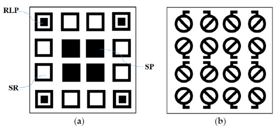 There are some advanced techniques used in reflectarray antennas that are reported in the literature for highly efficient operation. A work mentioned in [65] proposes a reflectarray of three different types of elements, namely, square patch (SP), ring loaded patch (RLP) and square ring (SR). The best effects of all these elements are combined together to achieve improved gain performance. The ring elements are selected for their wide reflection phase range, and the patch elements have a low loss performance. Collectively, the whole reflectarray, as depicted in Figure 7a, is represented as a high gain unit that is supported by a negligible phase error and a minimum reflection loss. A gain improvement of 1.9 dB was observed using this technique that offers a maximum gain of 29.1 dB. High-efficiency performance can also be obtained along with a dual band operation as proposed in [66], where an FSS (frequency selective surface) is used as an isolation middle layer to separate the two different reflectarrays. This structure acquires maxima of 54% and 50% efficiency with a dual feed operation at X-band and K-band, respectively.