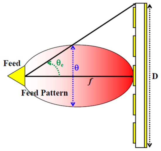 where θe is the half of the subtend angle from the feed to the edge of the reflectarray, as shown in Figure 8, and q is the exponent of the feed pattern function, given as cosqθ. This θ is the −3 dB beamwidth of the feed used in the reflectarray antenna. The equation of the half subtend angle (θe) can be derived from the geometry of the reflectarray antenna, as mentioned in Equation (7).