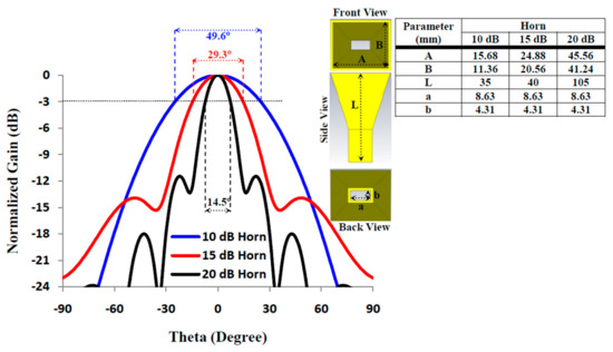 The commonly used feeds in the reflectarray antenna operation are pyramidal horn antennas. Like every antenna type, the gain of the pyramidal horn also depends on its −3 dB beamwidth. Its gain decreases as its beamwidth increases and vice versa. In this analysis, three different pyramidal horns with their respective gains of 10, 15 and 20 dB were selected to study their effects on the aperture efficiency of a circular aperture reflectarray. Their simulated and normalized E-plane radiation patterns at 26 GHz, along with their design specifications, are shown in Figure 9.