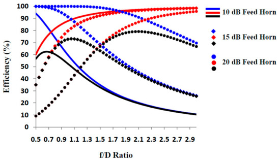 The illumination efficiency defines the aperture area of the reflectarray, which falls within the −3 dB beamwidth of the feed. On the other hand, the concentration of the wasted energy beyond the planar surface of the reflectarray is linked with the spillover efficiency. The quantities of these both efficiencies act alternatively, and a fall in the value of one would give a rise in the other significantly. Both of these quantities can be calculated using the following equations [3].
