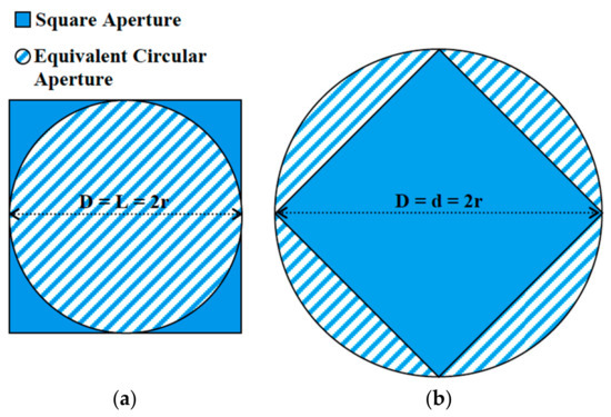 Square aperture with its equivalent circular aperture: (a) conventional square aperture; (b) square aperture in a diamond shape.