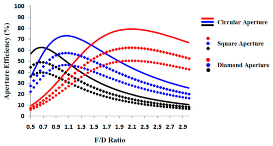 The mathematical expressions derived in Equations (12) and (16) show that the aperture efficiency of the reflectarray antenna depends on the selection of its aperture shape. Figure 13 compares the predicted aperture efficiency of a circular aperture reflectarray antenna with its equivalent square aperture reflectarray antenna. The equivalent aperture is taken in terms of its maximum dimension (D). It can be seen from Figure 13 that for each different feed horn the maximum aperture efficiency occurred at its respective feed distance (f/D), regardless of its different aperture shape. The feed distance related to the maximum aperture efficiency differs only with different feed types. This is because of the different beamwidths of each feed used in the aperture efficiency analysis, as already discussed in Section 4.1, although the amount of the maximum aperture efficiency at a certain feed distance changes with the change in shape of the aperture.