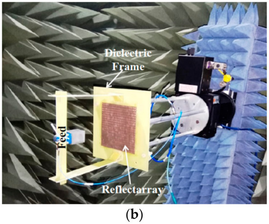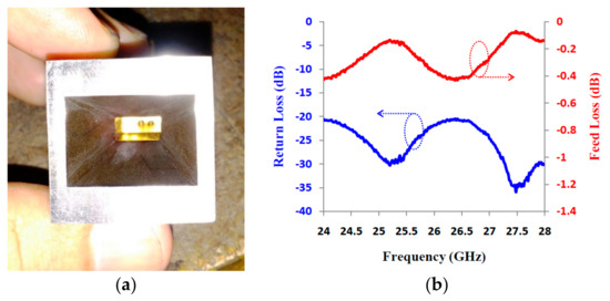 The most common feed used in the reflectarray design is the pyramidal horn antenna. The pyramidal horn feed used in this work is based on the principle of a standard horn antenna that can be used within the frequency band of 22–33 GHz. The fabricated pyramidal horn is shown in Figure 14a, and its dimensions were already mentioned in Figure 9 as the 10 dB feed horn. As depicted in Figure 14b, its loss performance has been measured with the help of a WR-34 coaxial to waveguide adapter in the frequency range between 24 and 28 GHz. The return loss shown in Figure 14b describes the resonance behavior of the pyramidal horn. It can be observable from Figure 14b that the return loss is considerably lower than the standard resonant benchmark of −10 dB level. It confirms a smooth resonating performance of the feed horn within the selected frequency band of 24–28 GHz. On the other hand, the feed loss is associated with the loss of energy inside the pyramidal horn during its operation. Good resonance behavior with negligible losses can be observed for the pyramidal horn within the selected frequency range. Due to very low loss performance of the pyramidal horn, feed losses in the reflectarray operation are often neglected.