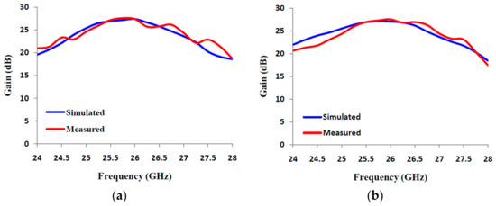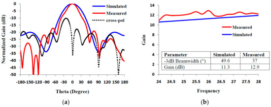 The dependency of the antenna efficiency on its gain and maximum directivity is discussed in detail in Section 2. The maximum directivity of the reflectarray antenna can be calculated using the formula given in Equation (2). In order to estimate the efficiency of the reflectarray antenna, its gain value is required either in simulated or in measured [76] form. The simulated and measured values of the gain of the selected reflectarray apertures with their respective efficiencies at 26 GHz are summarized in Table 3. The efficiencies mentioned here are referred to as the total efficiency of the reflectarray antenna. The efficiency is calculated either from the simulated or from the measured gain value, using the relation given in Equation (3). It has been noticed from Table 3 that the measured efficiencies for reflectarray apertures were higher than those of their simulated counterparts. This is because of a slightly higher measured gain as compared to the simulated gain for both reflectarray apertures. The reason behind the slightly higher measured gain is the shorter measured −3 dB beamwidth of the feed as compared to its simulated beamwidth, as already mentioned in Figure 15b. This shows that the feed characteristics in the simulations and measurements of the selected reflectarray apertures are slightly different. Moreover, the efficiency of the square aperture reflectarray can also be predicted using Equation (12), if the efficiency of its equivalent circular aperture reflectarray is known. Consequently, the efficiencies of the square aperture reflectarray can be calculated as 40.2% and 42.7% from the simulated and measured efficiencies of the circular aperture reflectarray, respectively. These two predicted values of the square aperture reflectarray efficiencies are almost the same as its actual simulated and measured efficiencies mentioned in Table 3. Furthermore, if the same square aperture reflectarray is set to operate in a diamond-like shape, then using Equation (16) its efficiency will further decrease to 32.6% and 34.6% for simulated and measured efficiencies of the circular aperture reflectarray respectively. That is why it is not recommended to use a square aperture reflectarray in a diamond-like shape with its diagonal considered as its maximum reflectarray dimension.