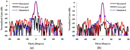 Measured and simulated E-plane radiation patterns with measured cross polarization of the selected reflectarrays at 26 GHz: (a) circular aperture reflectarray; (b) square aperture reflectarray.