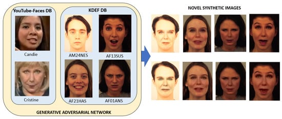 GAN is a framework including two deep networks, one (the generative) pitted against the other (the discriminative). This approach allows the neural network to create new data with the same distribution of training data. The generator attempts to produce a realistic image to fool the discriminator, which tries to distinguish whether this image is from the training set or the generated set []. In the proposed FER system, we used the GAN implemented for the DeepFake autoencoder architecture of the FaceSwap project (https://github.com/deepfakes/faceswap). In Figure 2, we show some novel synthetic images generated with GAN. The face images from the KDEF database are used as the base to create novel synthetic images using the facial features of two images (i.e., Candie Kung and Cristina Saralegui) selected from the YouTube-Faces database []. It can be seen as the novel images differ between each other, in particular with respect to the eyes, nose and mouth, whose characteristics are taken from the Candie and Cristine images. We created a database with these novel synthetic images that we have made public (https://mclab.diee.unica.it/?p=272).