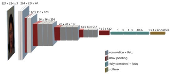 The CNN considered for the proposed FER model is the VGG16, a popular CNN proposed by Simonyan and Zisserman, which competed in the ImageNet Large Scale Visual Recognition Challenge achieving a top-5 accuracy of 92.7% []. The VGG16 has made improvements over the AlexNet CNN by replacing large kernel-sized filters (11 and 5 in the first and second convolutional layers, respectively) with multiple 3 × 3 kernel-sized filters one after another. The architecture of the VGG16 is shown in Figure 3.