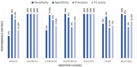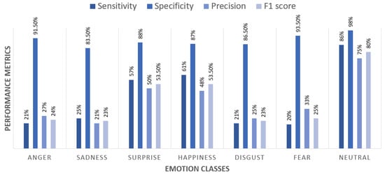 Furthermore, in Figure 4, we compare the sensitivity, specificity, precision and F1 score metrics computed for the single emotion classes when considering the best combination of DA techniques, i.e., GAN, HR and TR. From this comparison, it can be seen that sadness and disgust are the only emotions that are always 100% recognized. The happiness and neutral emotions are also recognized with great sensitivity (100%) and specificity (greater than 90%) but lower precision and F1 score, which highlight a greater rate of false positives for these emotions. Finally, anger, surprise and fear are the emotions achieving the worst performance. Indeed, although specificity is quite high (greater than 90%) for all emotions, the sensitivity is, respectively, 50%, 63% and 78%, highlighting a significant rate of false negatives. This can be justified by the similar face expressions manifested by the people when considering these three emotions.