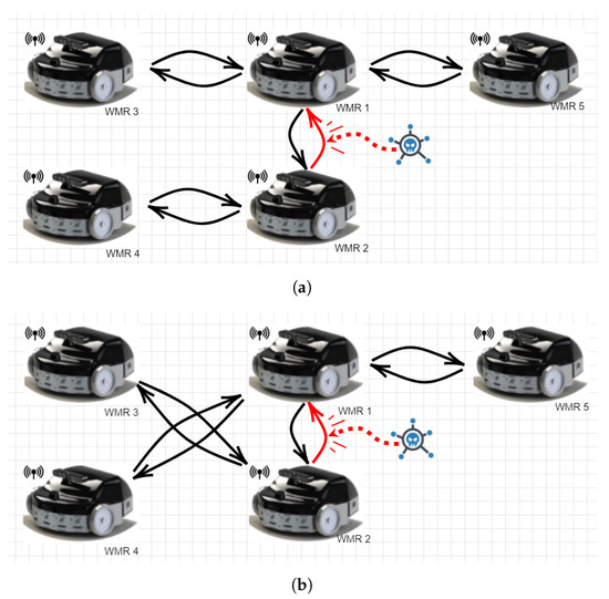An illustration of the interaction between the robots: (a) in the first 12 s and (b) after 12 s, where an arrow indicates the direction of information flow amongst two designated robots.