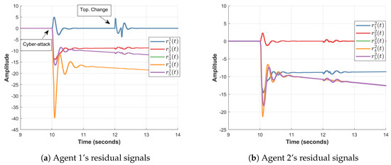 It should be recalled that these gains are valid for both scenarios. Figure 6 corresponding to the 2nd scenario shows that a cyber-attack in the form of the simulated functions and , incident to agent 1 in both topologies, can be distinguished even in the presence of some reasonable communication noise. Indeed, the residual signals , , , and stay around 0 after the cyber-attack appears in the system and throughout the topology change.