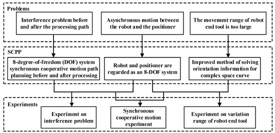 - Motion path planning of the robot and the positioner: The current research focus is on the path planning of the robot and the positioner during the processing path of the workpiece. To ensure processing accuracy, Jouaneh et al. [10] firstly proposed a processing strategy of collaborative motion between positioner and robot. This strategy used the method of constant speed to track the path to make the 5-DOF robot and 2-DOF positioner move simultaneously. Shi et al. [18] studied robots’ and positioners’ trajectory planning in the process of coordinated welding of intersecting tubes, and Shi et al. proposed an algorithm for generating motion codes for welding intersecting tubes. This algorithm used the welding speed control as the basis of the industrial robot’s trajectory planning, and it can prevent the cable winding up. Wu et al. [12] proposed a trajectory planning strategy for the coordinated movement of a 6-DOF manipulator and a 2-DOF positioner. This strategy used AutoCAD for offline trajectory planning and then converted them into robot language. Liu et al. [15] proposed a new laser scanning based non-ideal tube intersection curve robot welding path planning method. This method integrated the generation of a laser scanning trajectory and the path planning of non-ideal tube welding to avoid the negative impact of the uphill and downhill welding quality on the welding. The research focus of these scholars is the path planning of robots and positioners on the processing path, and the path before and after the processing path is not systematically planned.