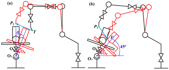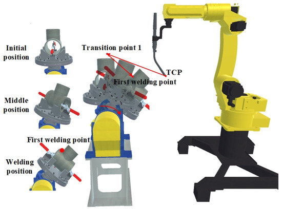 The pose changes of the robot and the positioner from T to P1 are shown in Figure 4a. The pose of robot welding torch and positioner are adjusted before they reach the P1. Thus, the angle of positioner 7-axis is rotated α, and the welding torch is vertically downward. When the pose changes the robot and the positioner from P1 to F, the angle of positioner 7-axis is rotated 45° and the robot moves from P1 to F (Figure 4b).