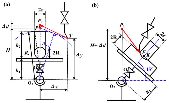 The positions of points P1 and F are shown in Figure 5. The parameters in Figure 5 are defined as following: The distance between the rotation center of the positioner’s 7-axis and the plane of the workpiece table is h1; the distance between the plane of the workpiece table and the plane of the workpiece branch pipe is h2; the main radius is R and the radius of the branch pipe is r. The 7-axis rotation center O7 of the positioner is regarded as the foundation to build the coordinate system on, and the initial position of the robot TCP is T(Δx, Δy).